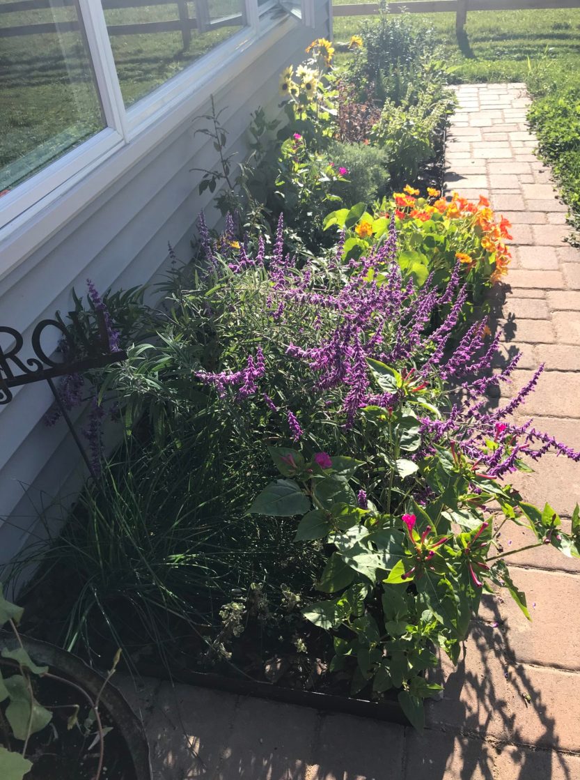 Instead, even as fall deepens into upcoming winter, I go to sit on our patio, 10 feet from the bird feeding stations. 12 from the mixed border beneath the bedroom windows. I watch the little finches jockey for seed, and a portly blue jay crane his neck to reach a feeding hole on the sunflower tube. The sun is like warm honey, and life is very very good.